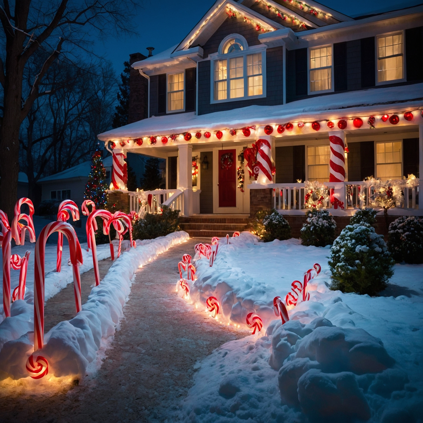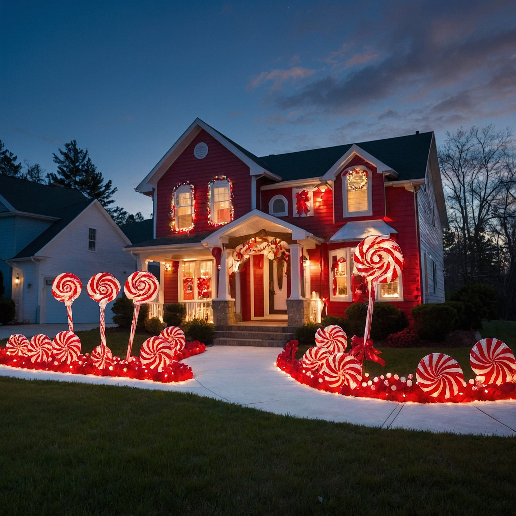 Red and white lights, oversized lollipop decorations, and a path lined with illuminated candy canes turn your front yard into a sweet treat. It’s like stepping into a real-life Candyland board!