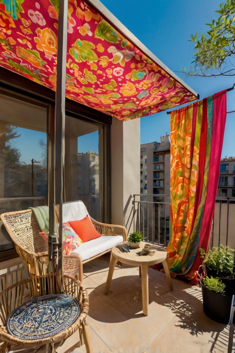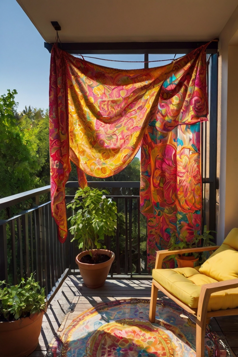 If you’re looking to add some shade and color, consider hanging bright fabric panels overhead. This not only creates a visually interesting canopy but also provides some protection from the sun.