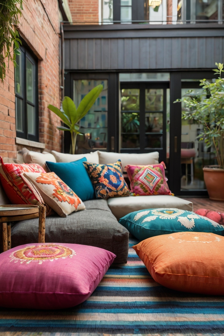 If you enjoy outdoor dining but don’t have space for a full dining set, consider creating a picnic area. Lay out a weather-resistant outdoor rug and add some large floor pillows. It’s a casual and comfortable way to enjoy meals outdoors.