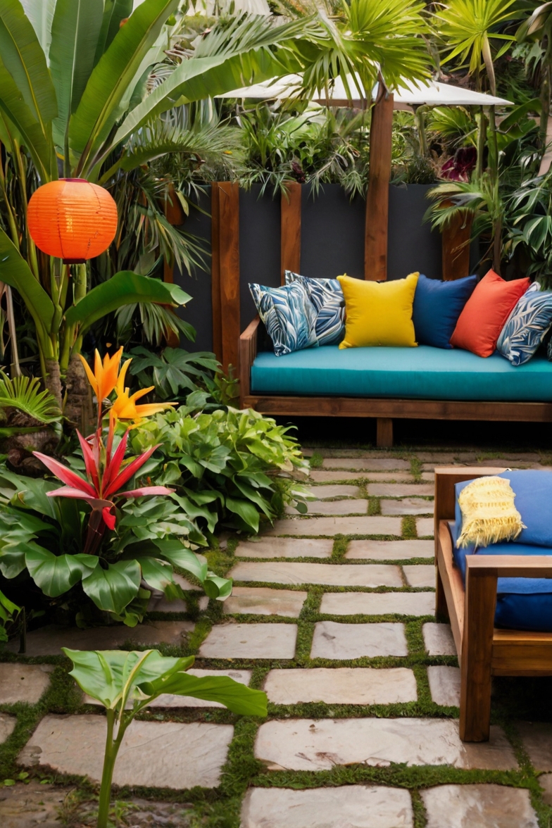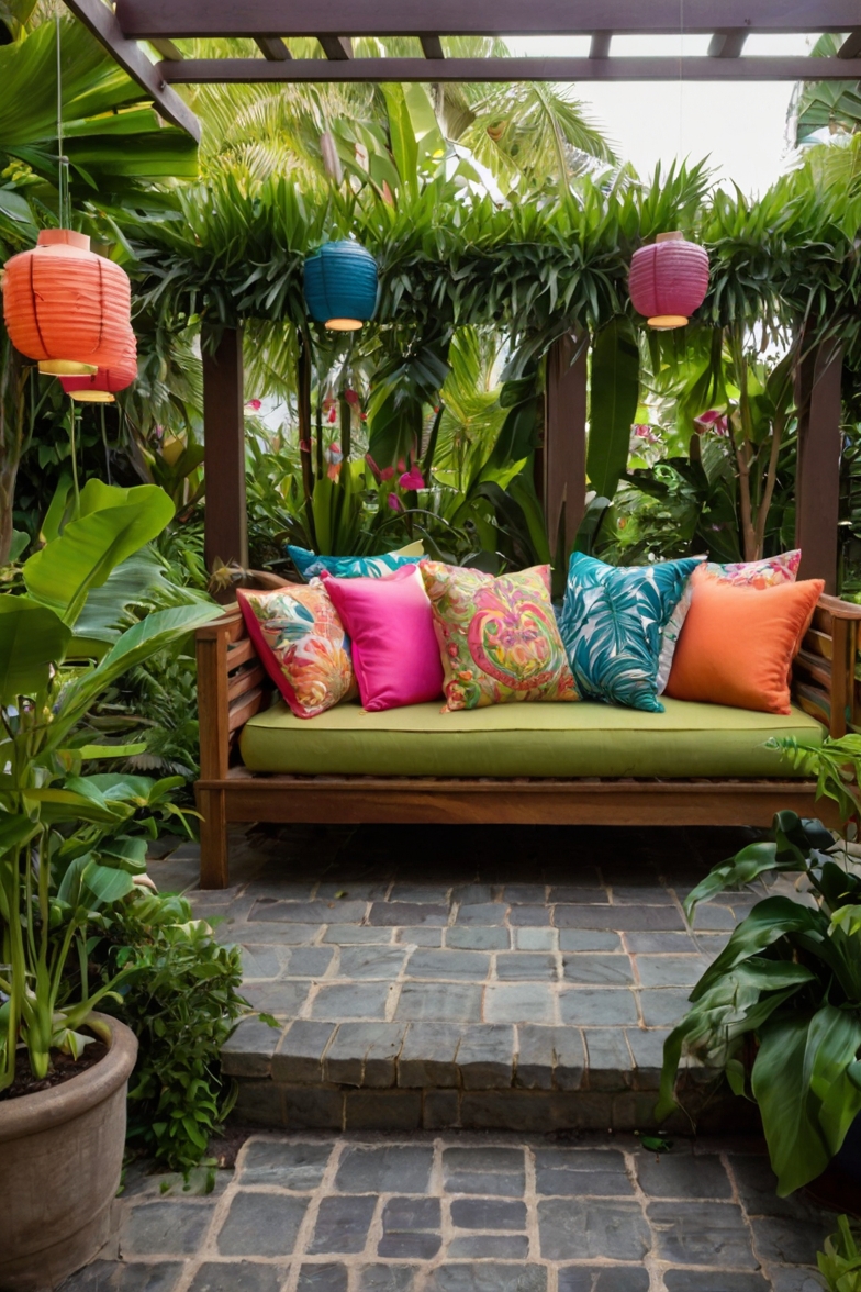 Our tropical paradise patio is a riot of greenery and color. The focal point is a gorgeous teak daybed piled high with colorful pillows. Surrounding the seating area are large-leafed tropical plants like banana trees and birds of paradise. Strings of colorful lanterns are strung overhead, ready to cast a warm glow as evening falls.