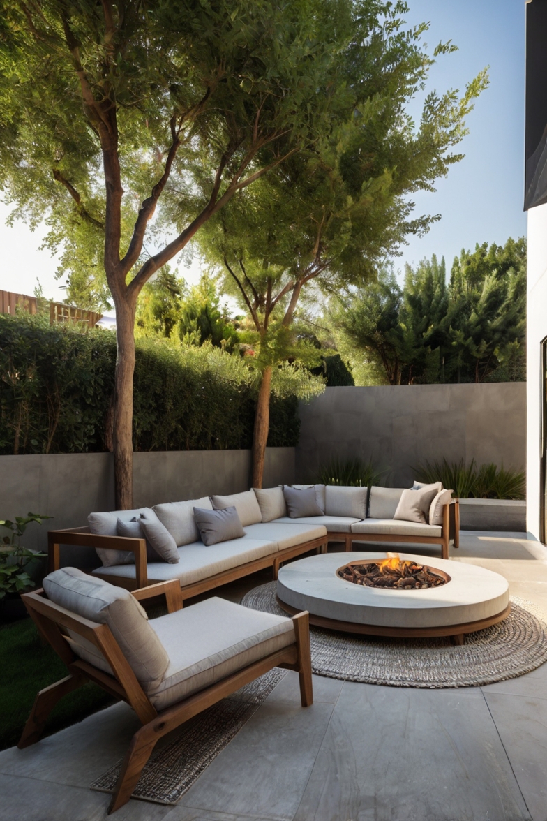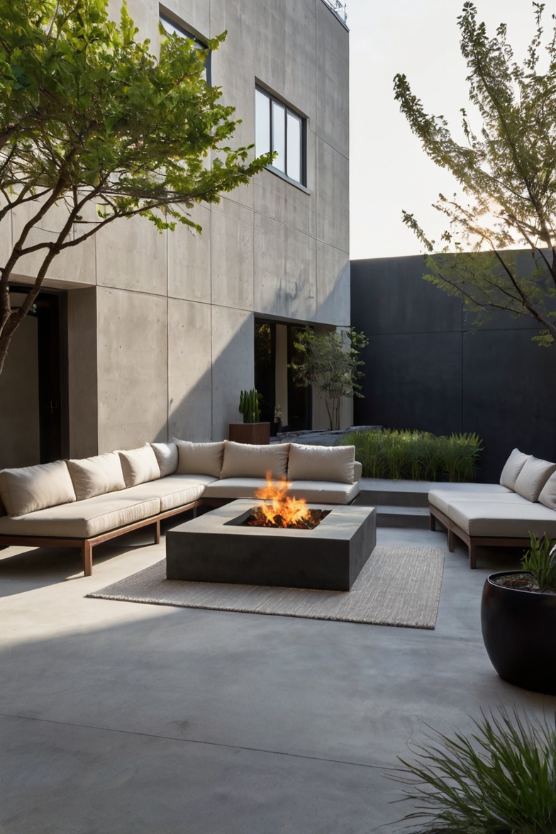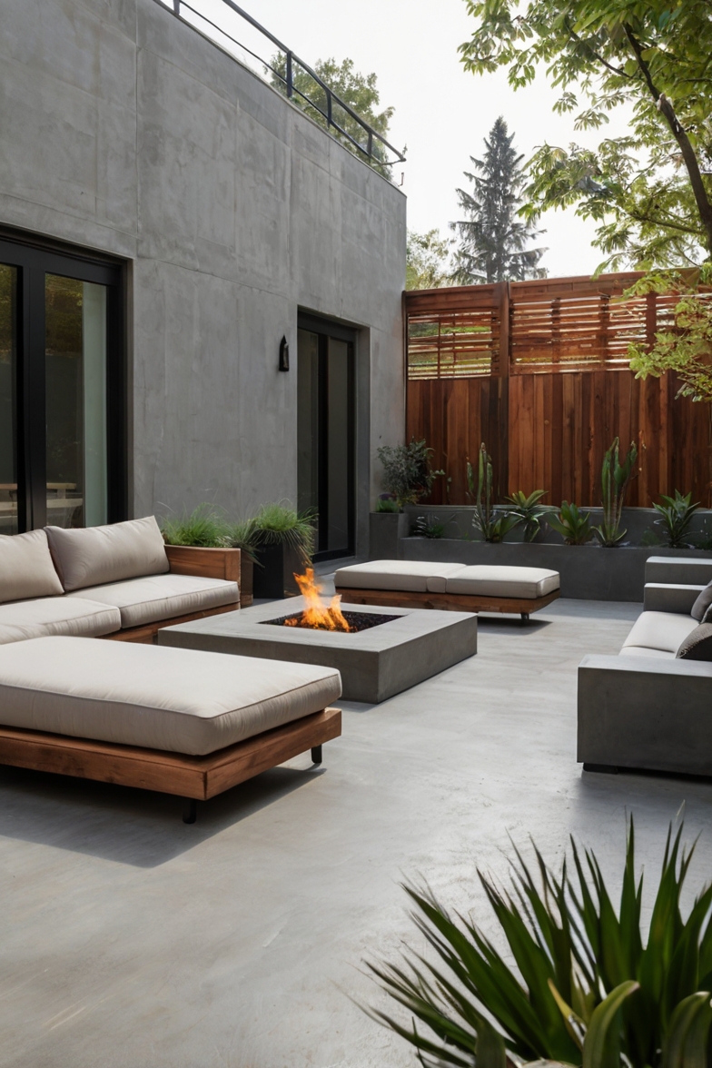 In our minimalist patio, we see a large, open space with smooth concrete flooring. A low-profile sectional in a light gray or beige anchors one end of the patio, facing a simple fire pit. A few carefully placed potted plants in square concrete planters add a touch of greenery without cluttering the space. The overall effect is calm, serene, and utterly sophisticated.