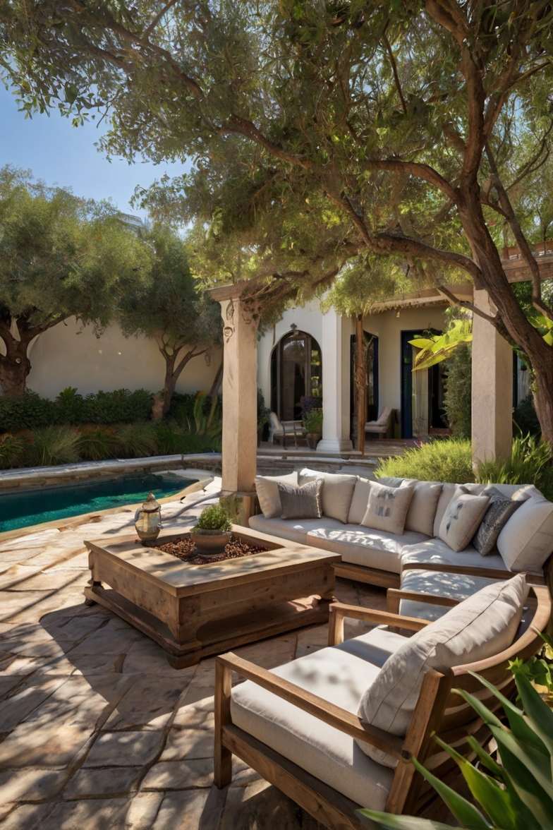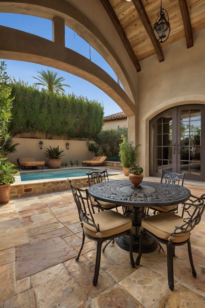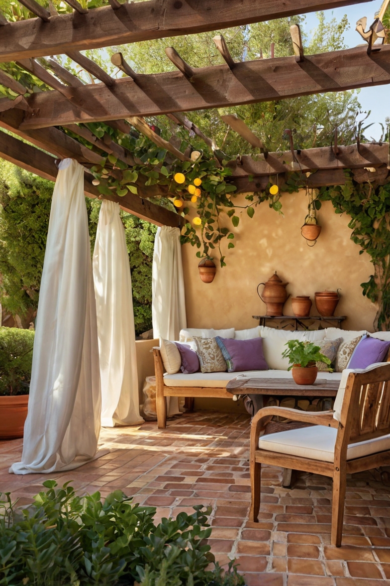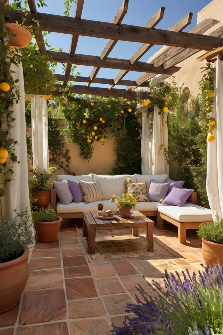Here we see a spacious patios with honey-colored stone flooring. Terracotta pots filled with lemon trees and lavender add pops of color and Mediterranean charm. A pergola overhead is draped with billowing white curtains, providing shade and a breezy, romantic feel.