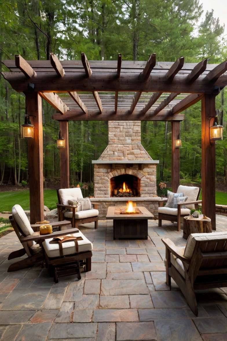 Our rustic chic patio features a beautiful wooden pergola with a stone fireplace as its centerpiece. Comfortable Adirondack chairs in a weathered finish are arranged around the fireplace, topped with plaid throws for chilly evenings. A rough-hewn wooden coffee table is perfect for holding mugs of steaming cocoa, while string lights twinkle make for a cozy ambiance.