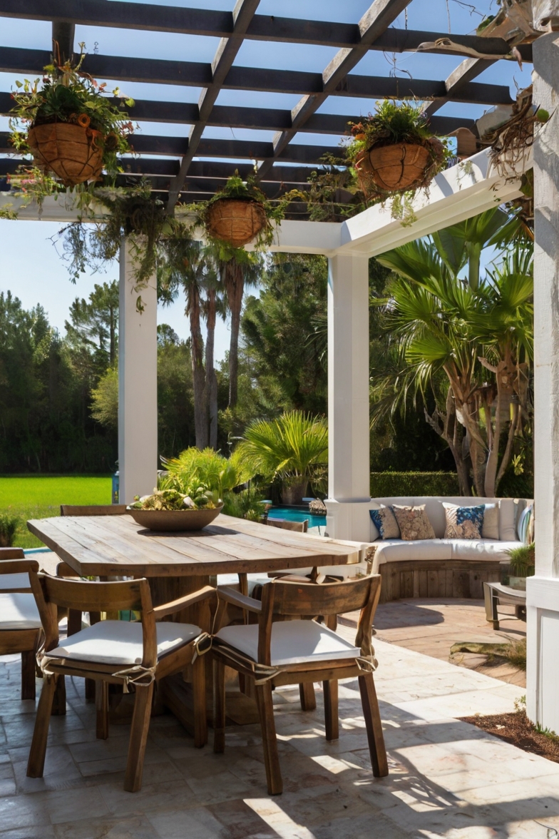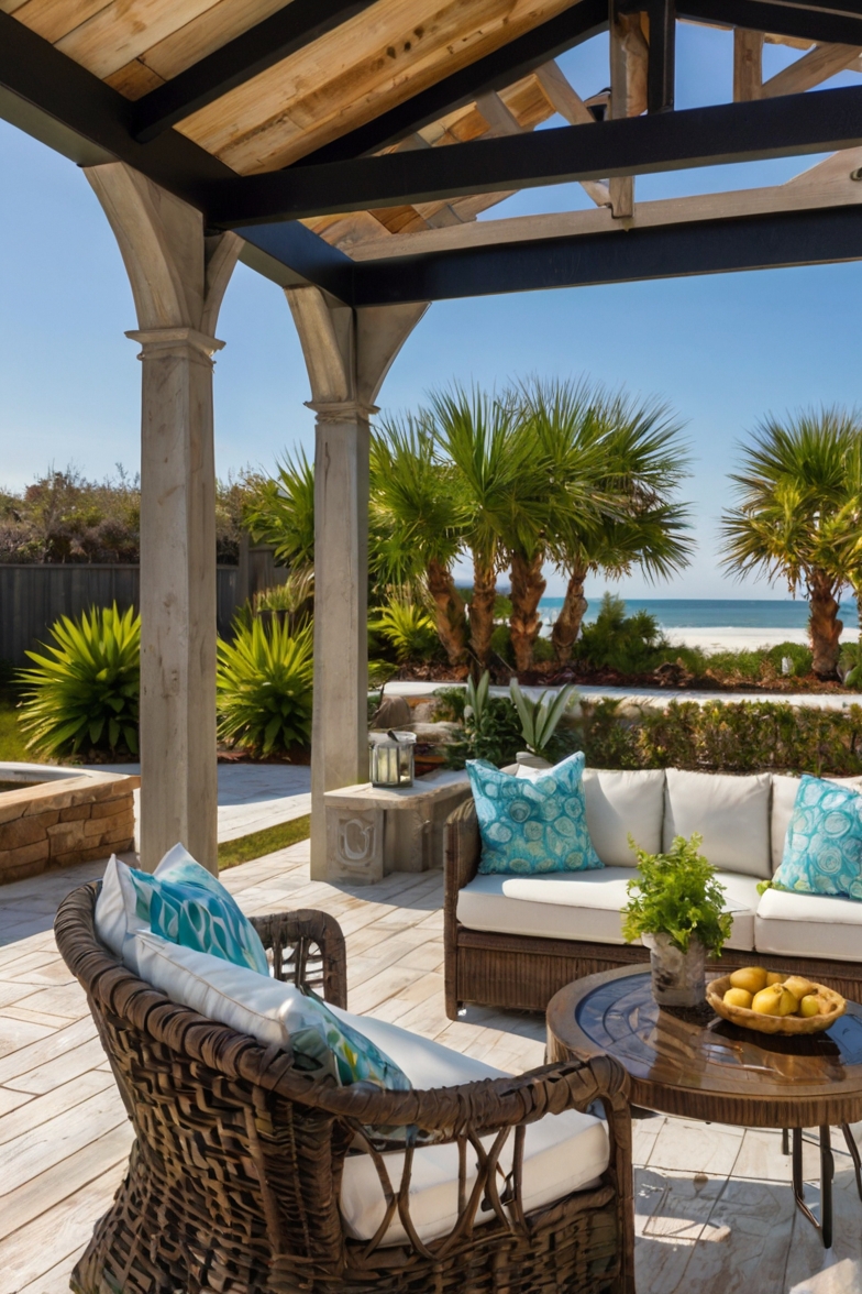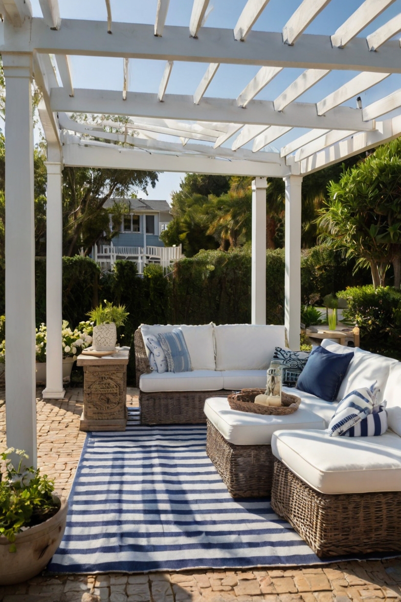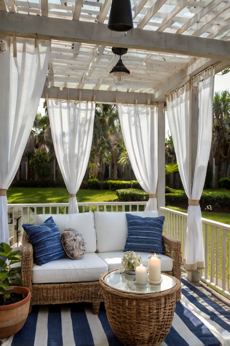 Our coastal patio is a vision in white and blue. A weathered white wooden pergola frames a seating area with comfortable sofas upholstered in a crisp navy and white striped fabric. Weathered wood side tables hold hurricane lamps and seashells. A braided jute rug underfoot adds texture, while billowing white curtains on the pergola sway gently in the breeze.