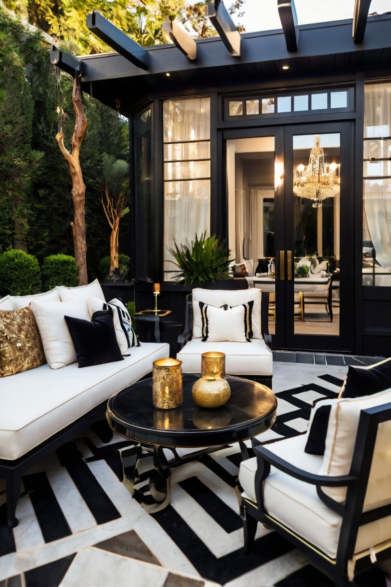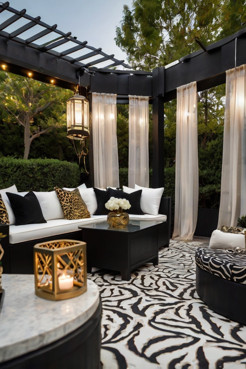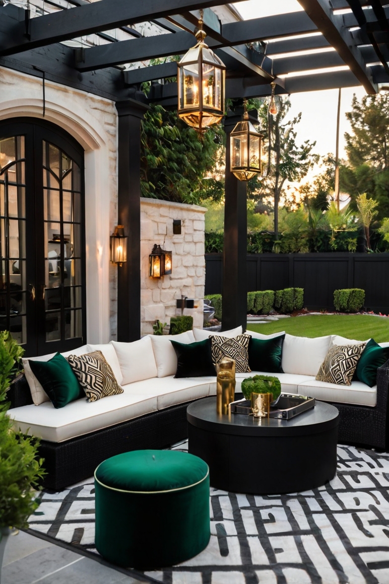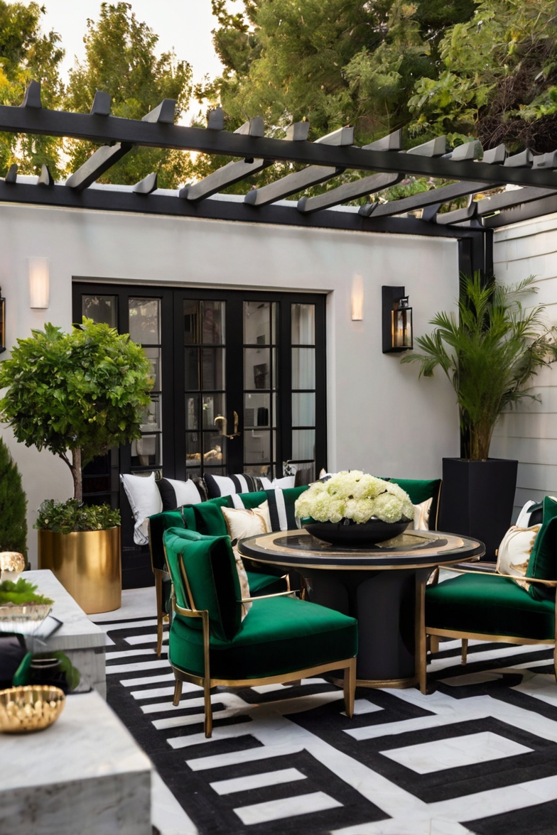 Our Hollywood glam patio is all about drama and luxury. A black and white striped awning shades a seating area with curved velvet sofas in a deep emerald green. Gold side tables hold elegant lamps with silk shades. A vintage bar cart is ready to serve up classic cocktails, while a statement chandelier overhead adds a touch of over-the-top glamour.