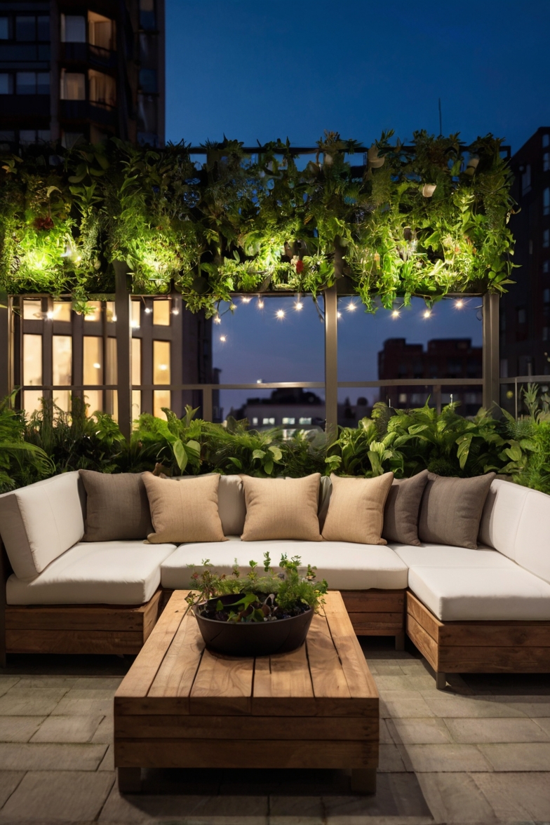 Our urban rooftop patio makes the most of limited space. A modular sofa can be reconfigured for dining or lounging. A vertical garden wall brings lush greenery to the space without taking up valuable floor area. String lights are crisscrossed overhead, creating a magical atmosphere for enjoying the twinkling city lights.
