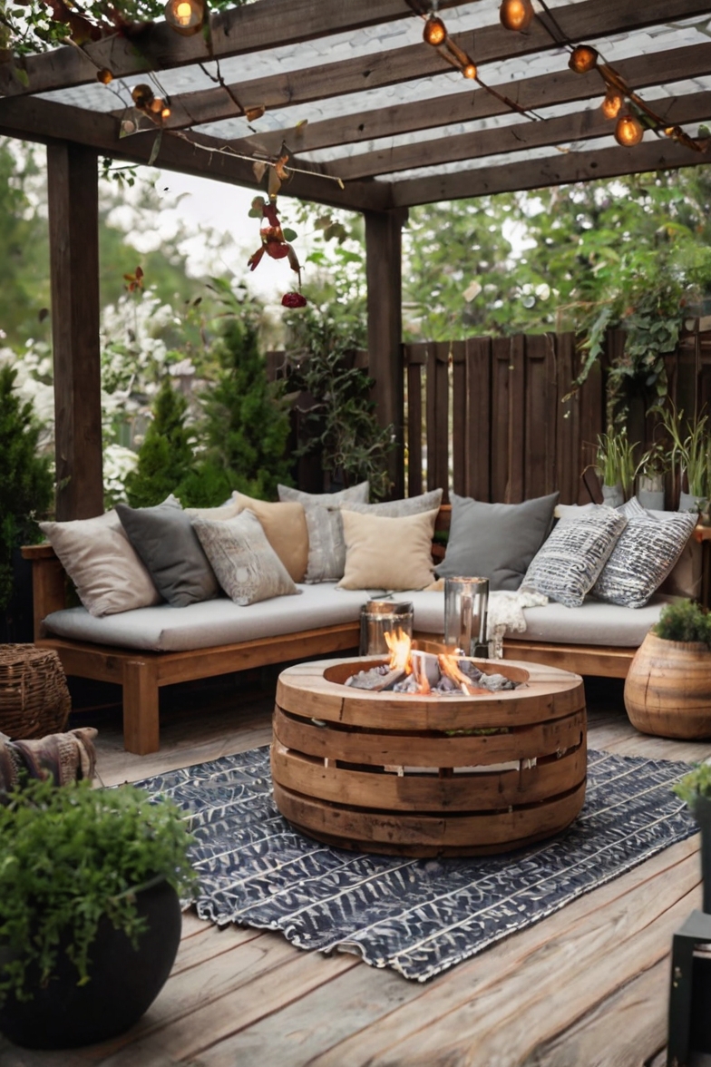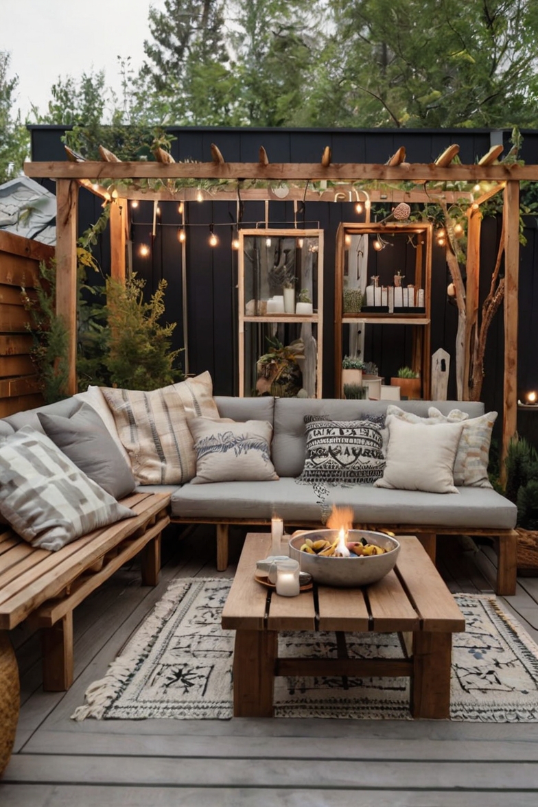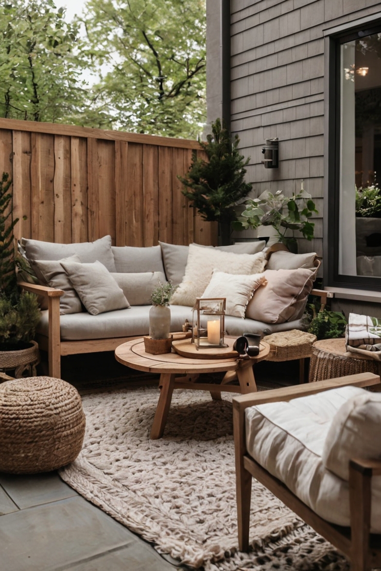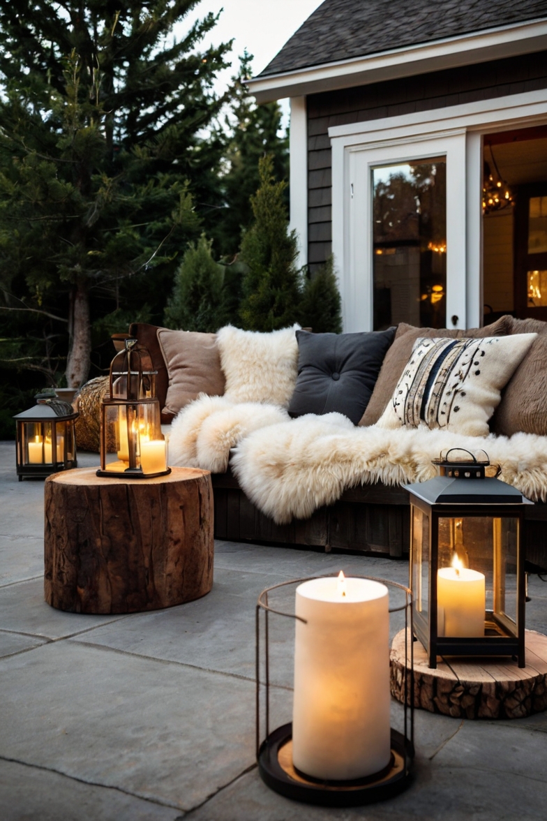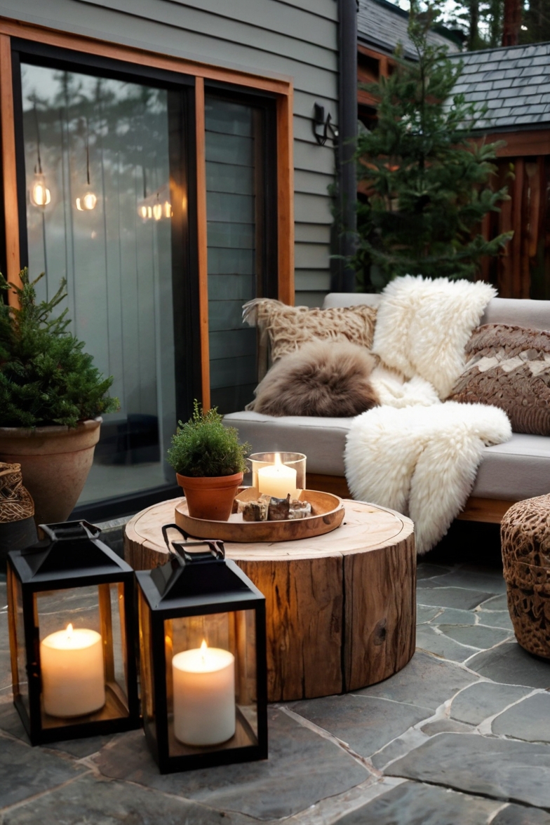 Our Scandinavian patio is an inviting nook of comfort. A simple wooden bench piled high with sheepskin throws and knit pillows creates a cozy seating area. Lanterns and candles provide soft, warm light. Potted evergreens bring a touch of nature to the space, while a simple fire pit offers warmth on cool evenings.