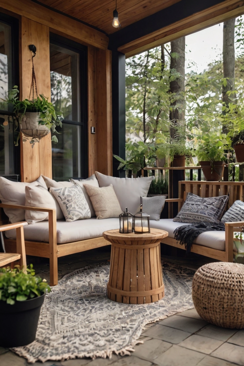 Our bohemian patio is a feast for the eyes. A colorful Moroccan-inspired tile floor sets the stage for a mix of seating options – think floor cushions, a macramé hanging chair, and a vintage rattan peacock chair. Layered rugs add comfort and visual interest. Plants in mismatched pots bring life to the space, while colorful lanterns and string lights create a magical atmosphere.
