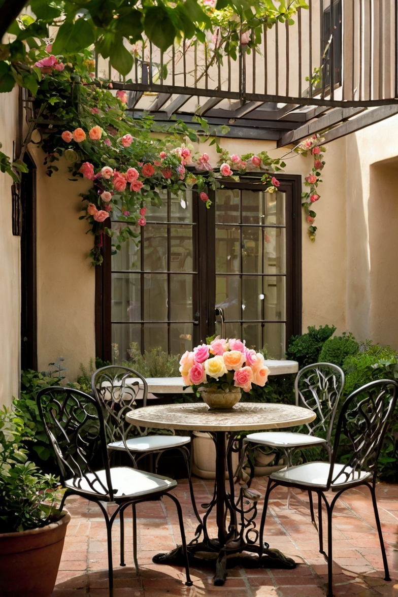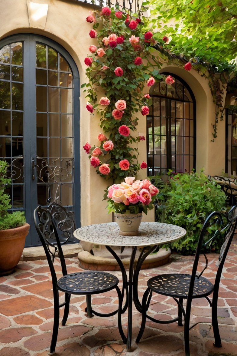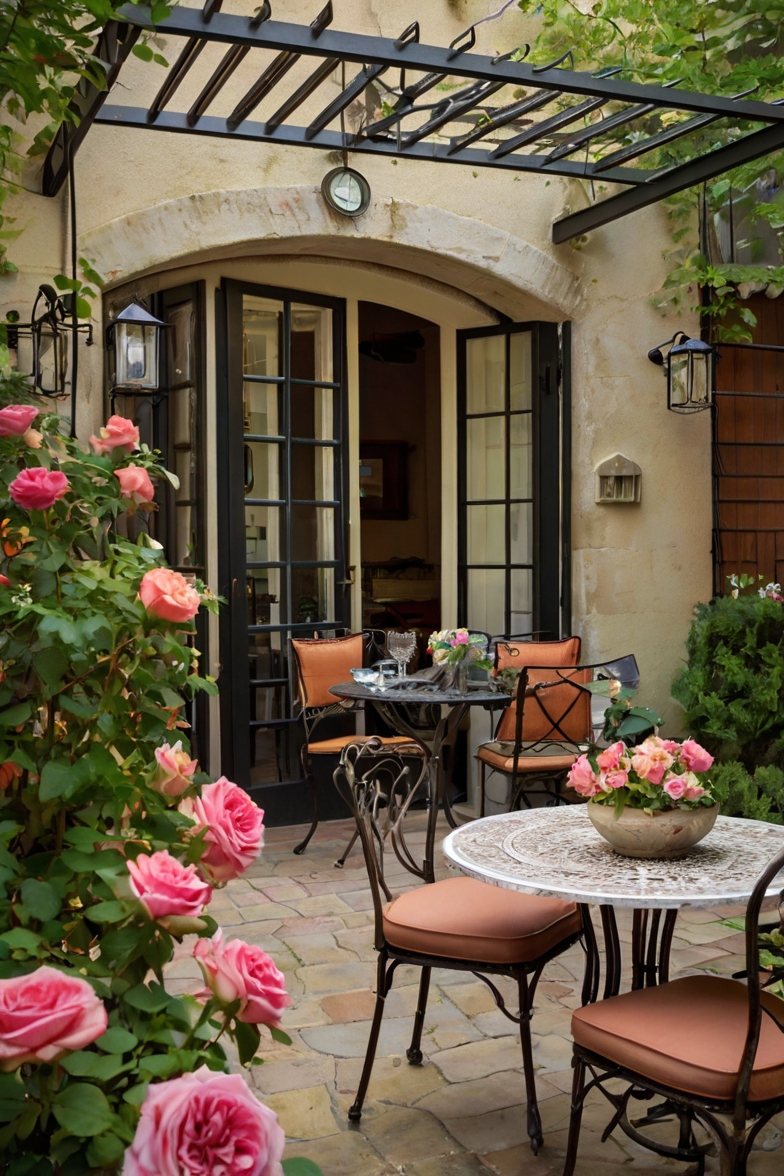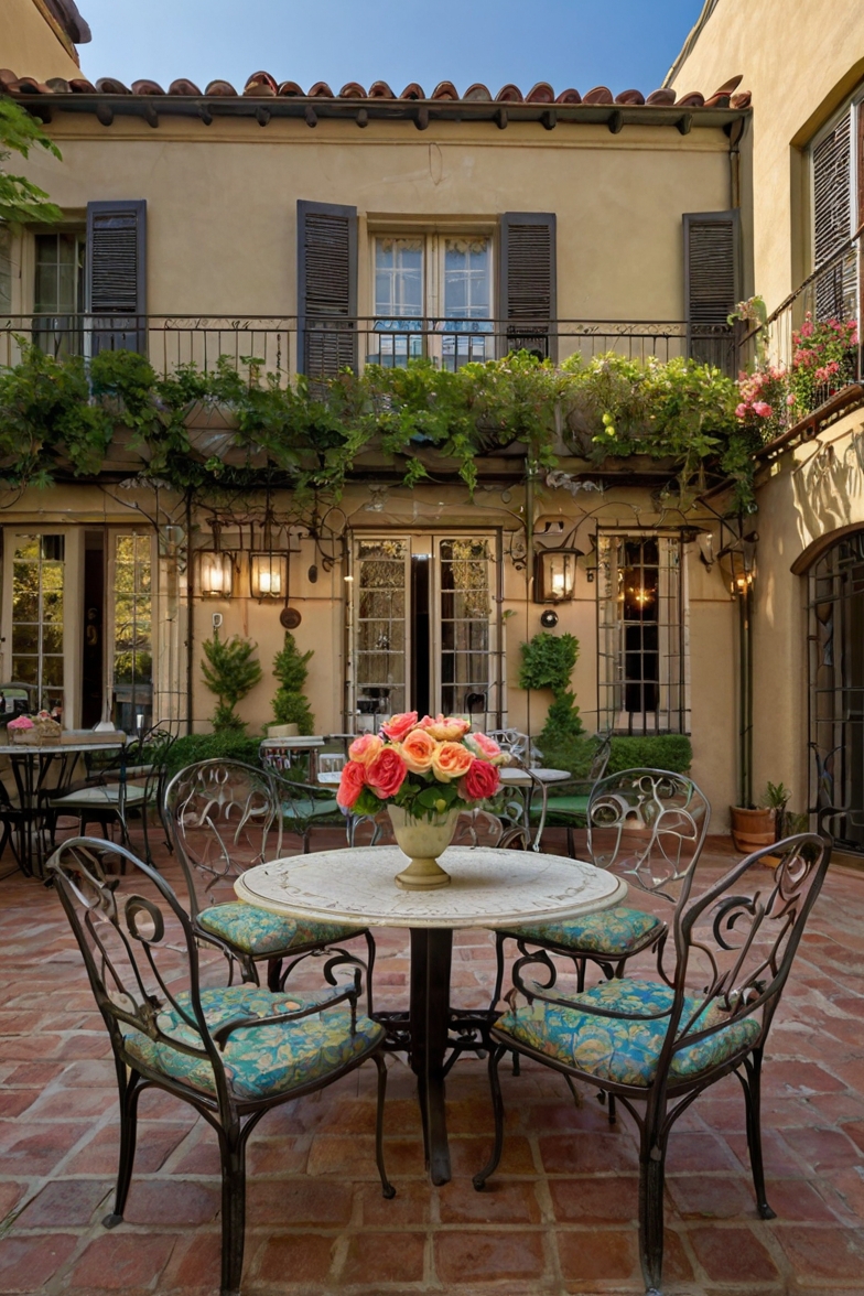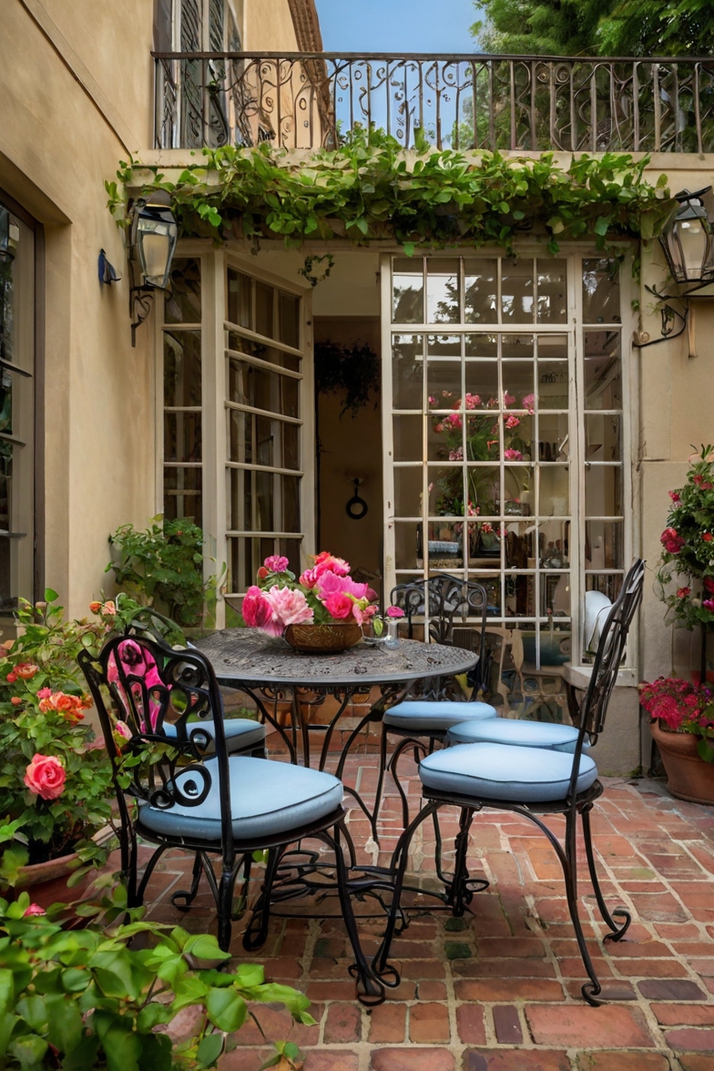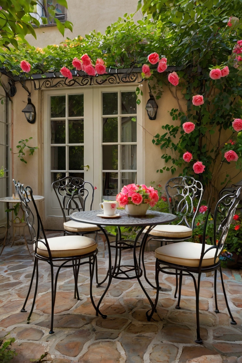 Our French courtyard patio is utterly charming. A wrought iron table and chairs with a delicate filigree pattern form the centerpiece. Climbing roses ramble up a trellis, while window boxes overflow with colorful blooms. A small fountain bubbles quietly in one corner, and classic bistro chairs provide additional seating for sipping coffee or wine.