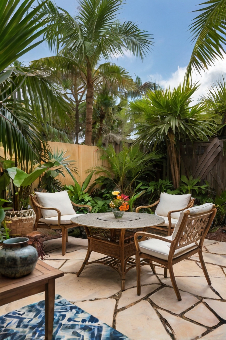 Our Zen garden patio is a study in tranquility. A wooden platform extends over a small koi pond, creating a perfect spot for meditation or yoga. Carefully placed rocks and meticulously raked gravel create visual interest. A simple bamboo water feature provides a soothing background sound. Bonsai trees and moss add pops of green to the serene space.