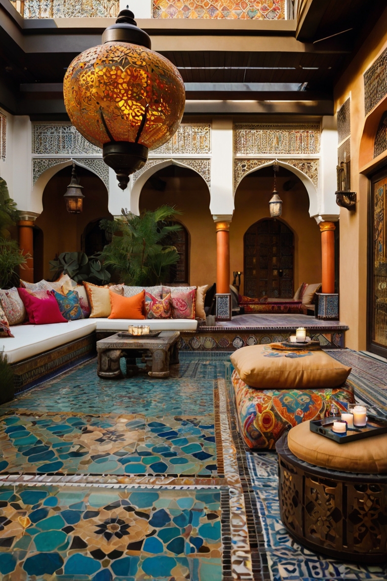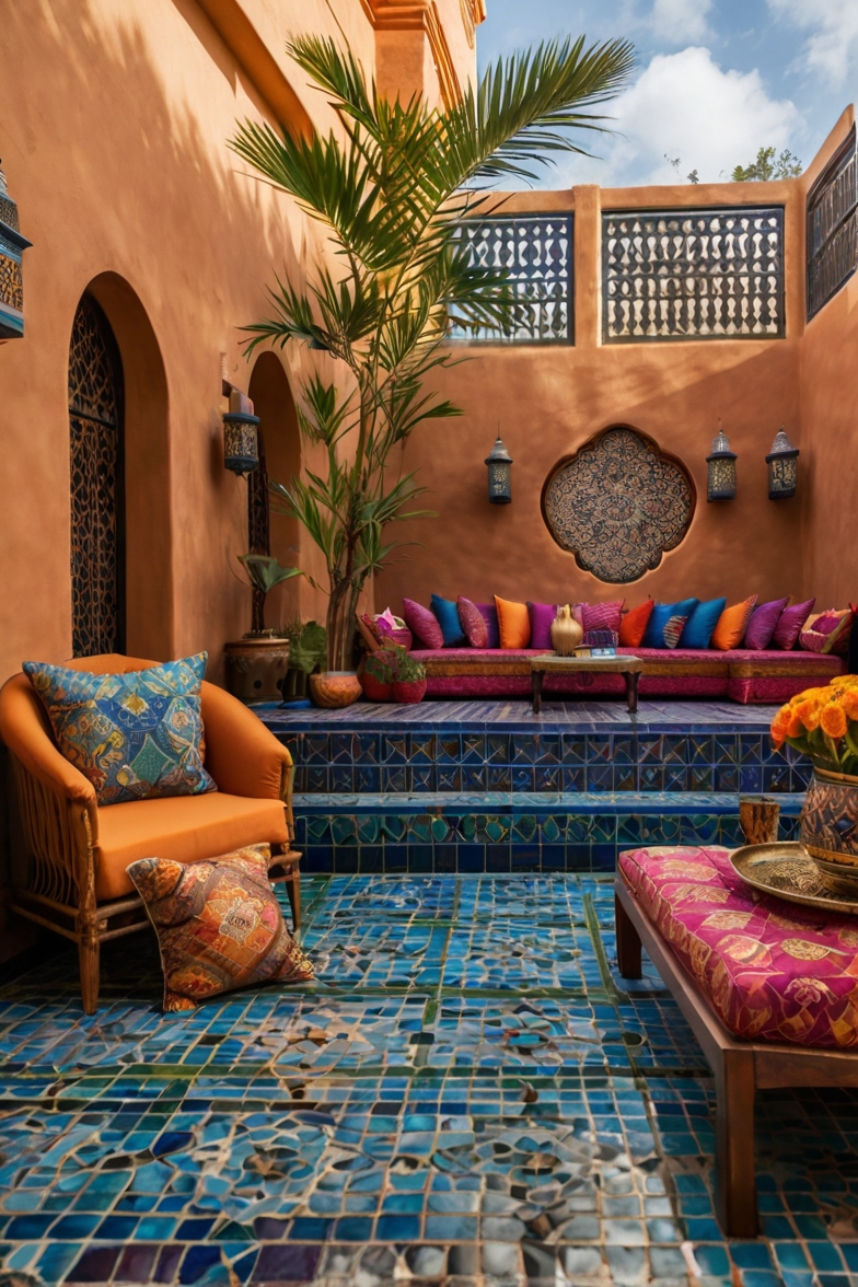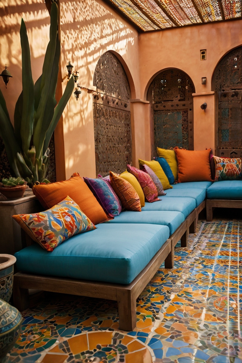 Our Moroccan-inspired patio is a riot of color and pattern. Low sofas and poufs upholstered in rich fabrics provide plenty of seating. An intricate tile mosaic covers the floor, while a tiled fountain adds a soothing water element. Pierced metal lanterns cast intricate shadows as the sun sets, and gauzy curtains can be drawn for privacy.